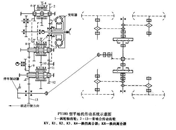 徐工PY180型平地機的傳動系統(tǒng)采用發(fā)動機、液壓變矩器、動力換擋變速器的傳動形式。他的傳動原理簡圖如下。